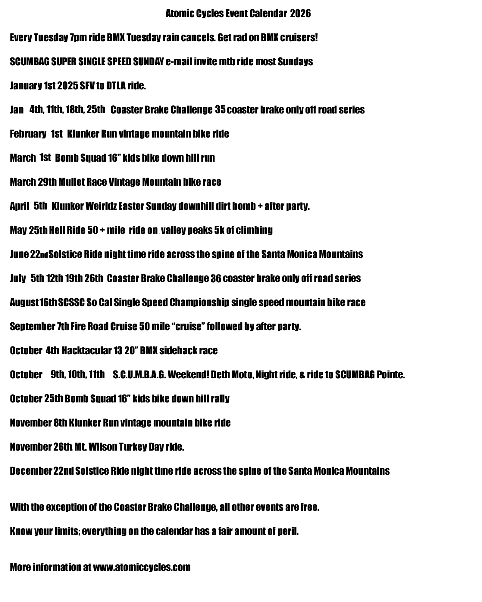 Jan 4th, 11th, 18st, 25th. On Sundays. Coaster Brake only single speed only off road rally. Heat winner and overall winner at end of the series. I have loaner bikes.