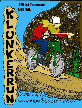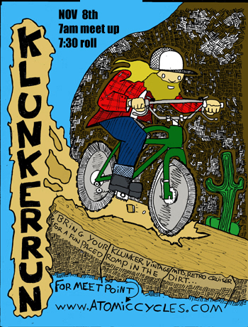 Klunker run is a vintage mtb ride. The emphasis is on pre-cursor repurposed cruisers but any bike is fine. Drawing the line as to what is vintage and what is not is up to heated debate, I’d say 1990 would be fair but if you have the newest carbon fiber wonder bike and want to roll with us I have no problem with that.